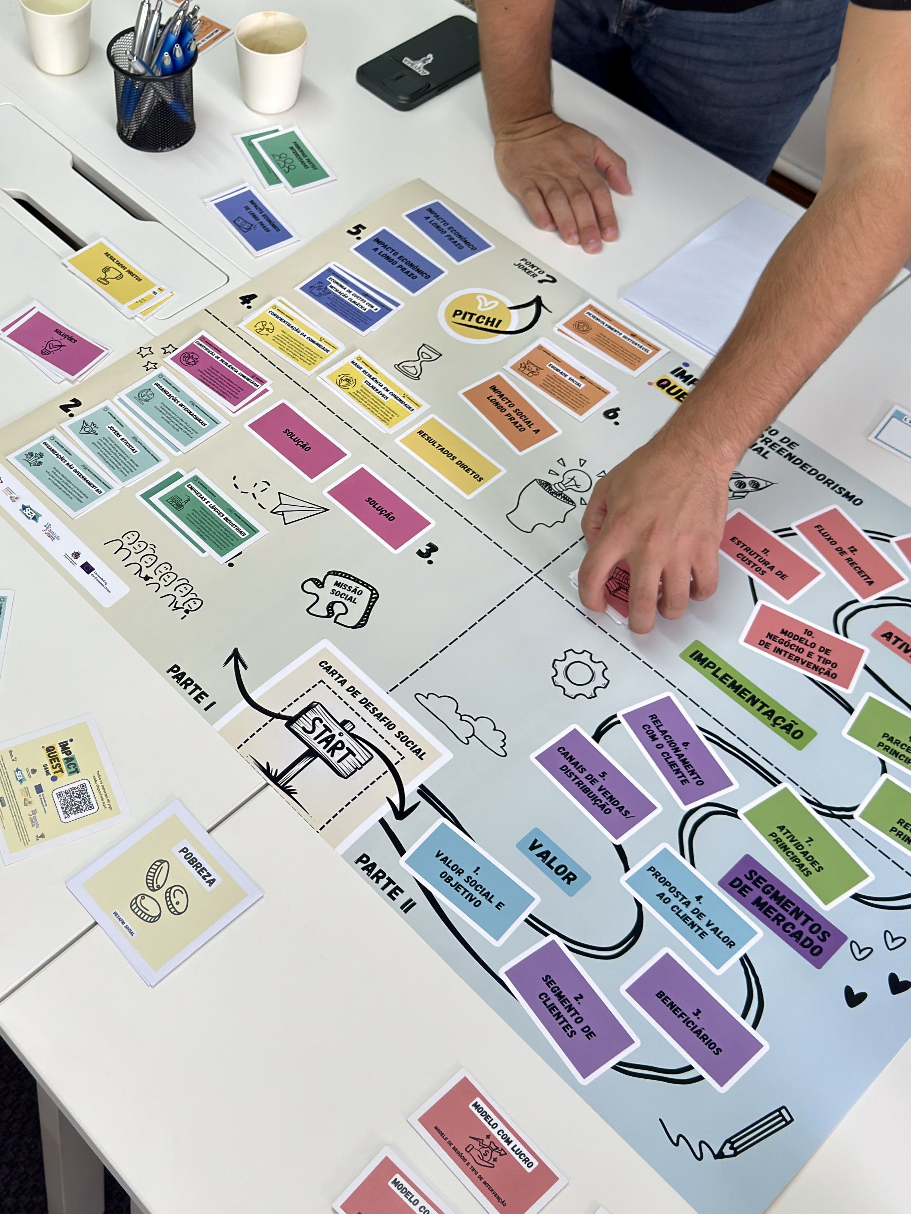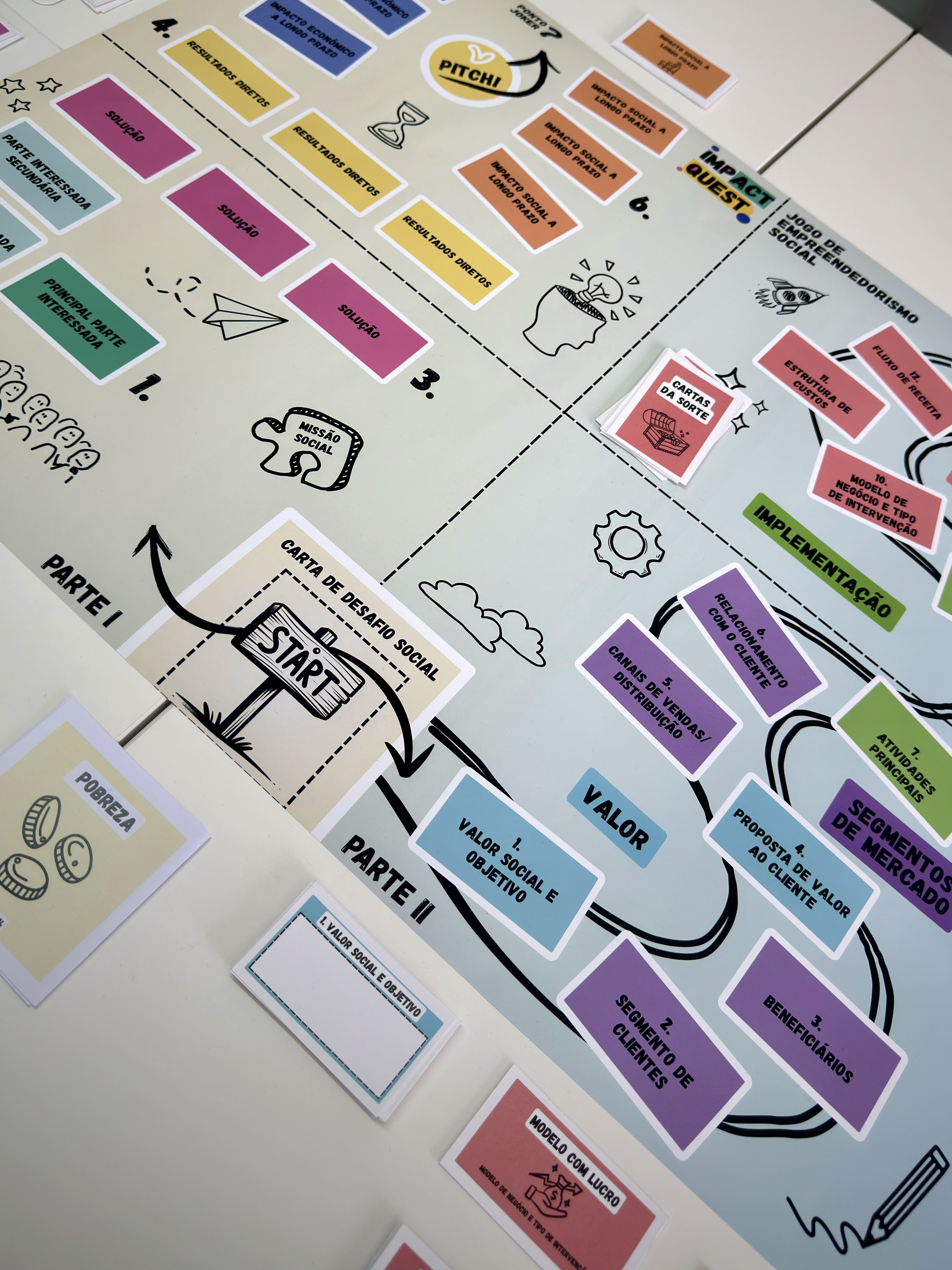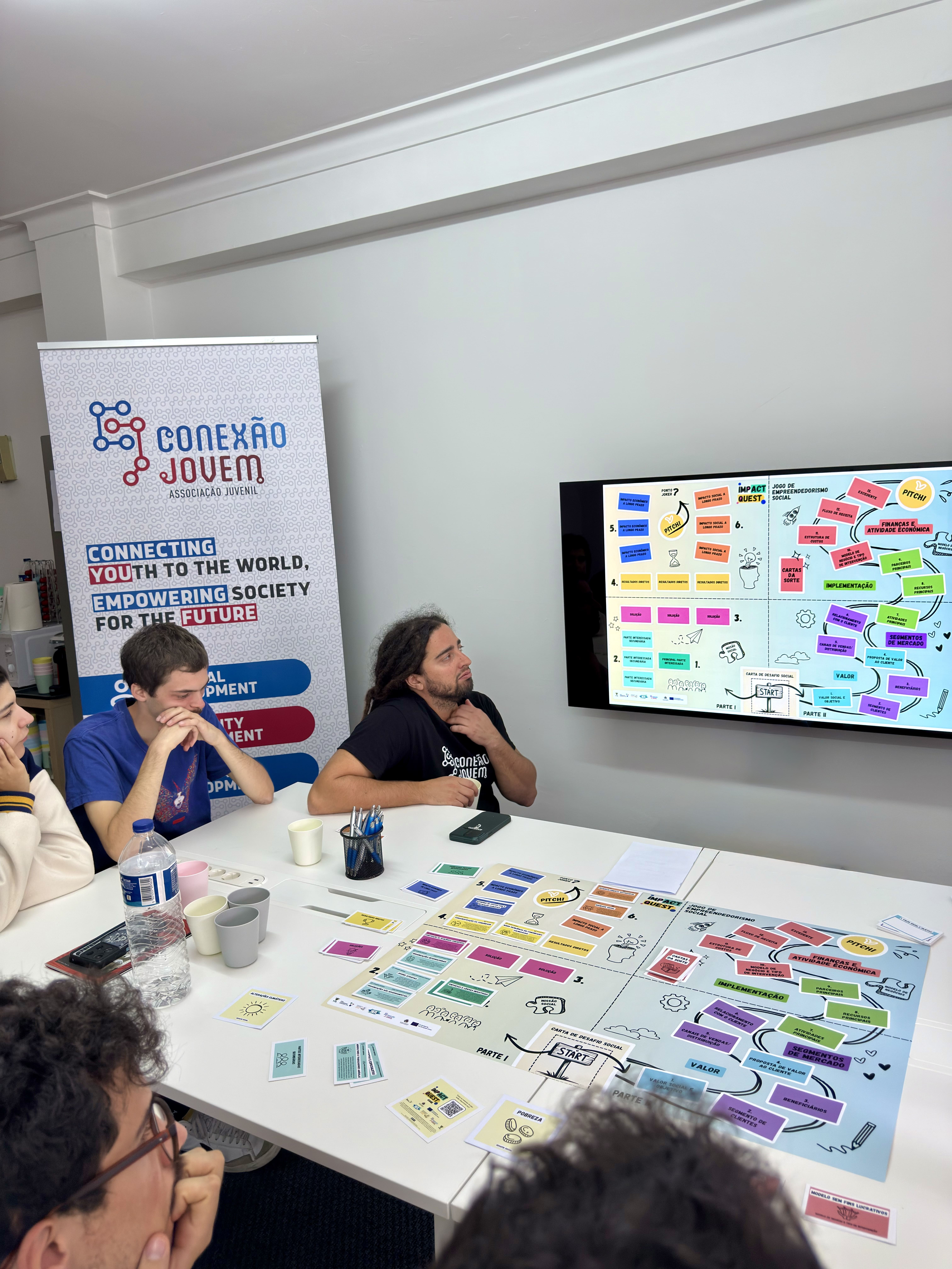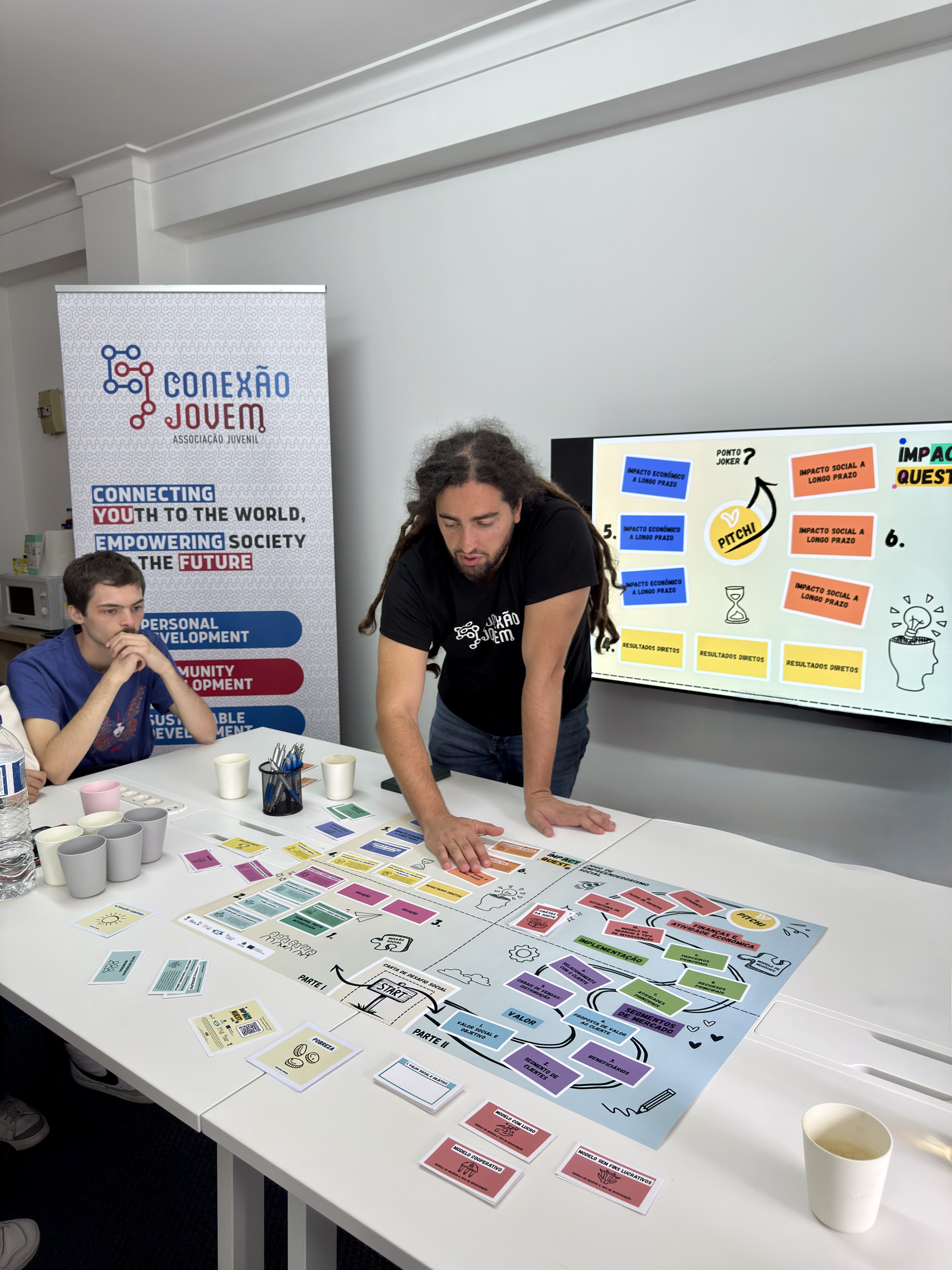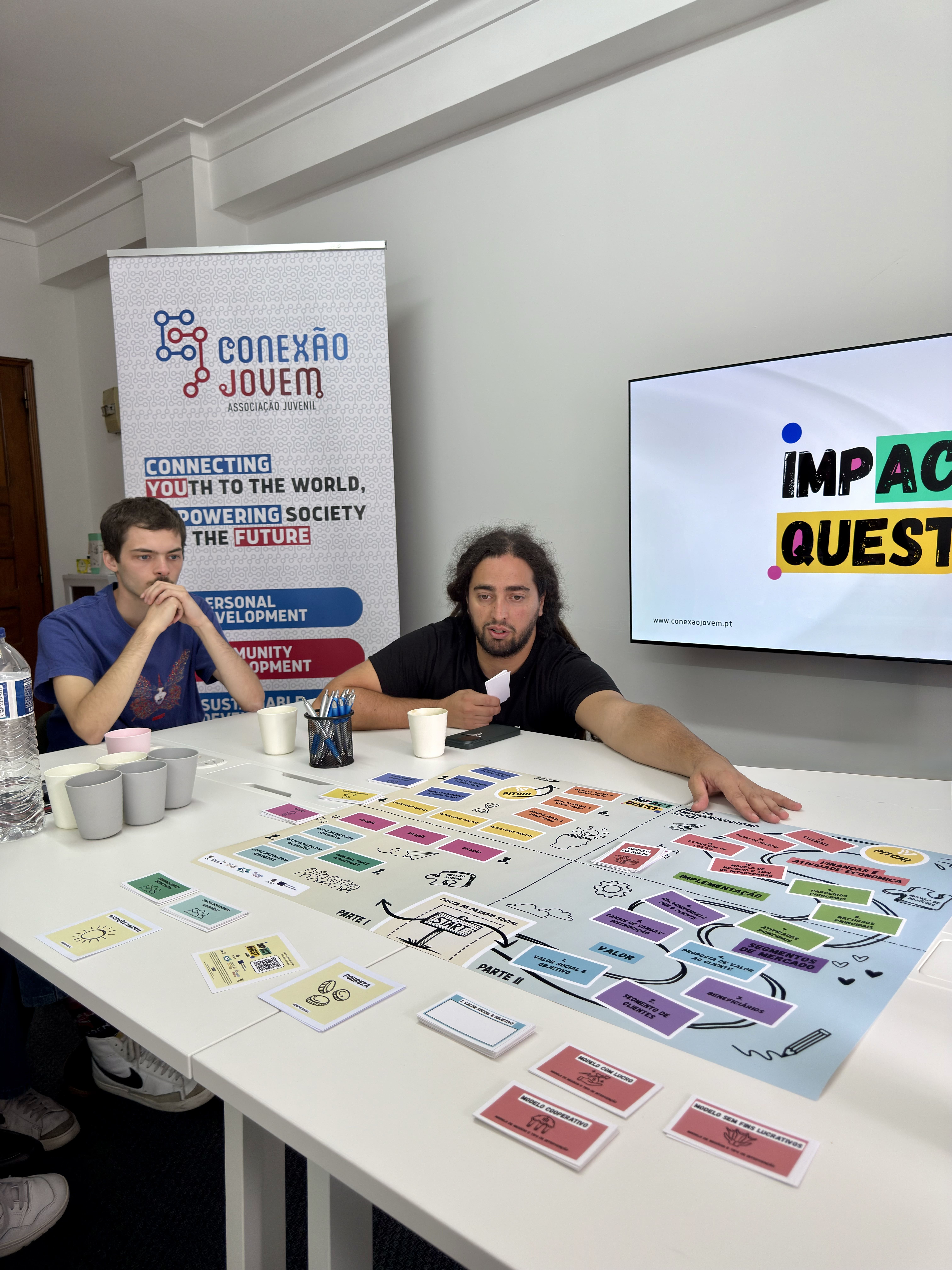 O encontro começou com uma receção aos participantes, seguida de uma breve contextualização sobre o projeto, os seus objetivos e o percurso que levou à criação deste recurso. Depois desta introdução, passámos àquilo que todos queriam ver: a apresentação do jogo. Explicámos as regras, as ferramentas incluídas e a lógica por detrás das diferentes mecânicas, mostrando como o “Impact Quest” pode ser utilizado para explorar desafios reais de empreendedorismo social de forma prática e envolvente.